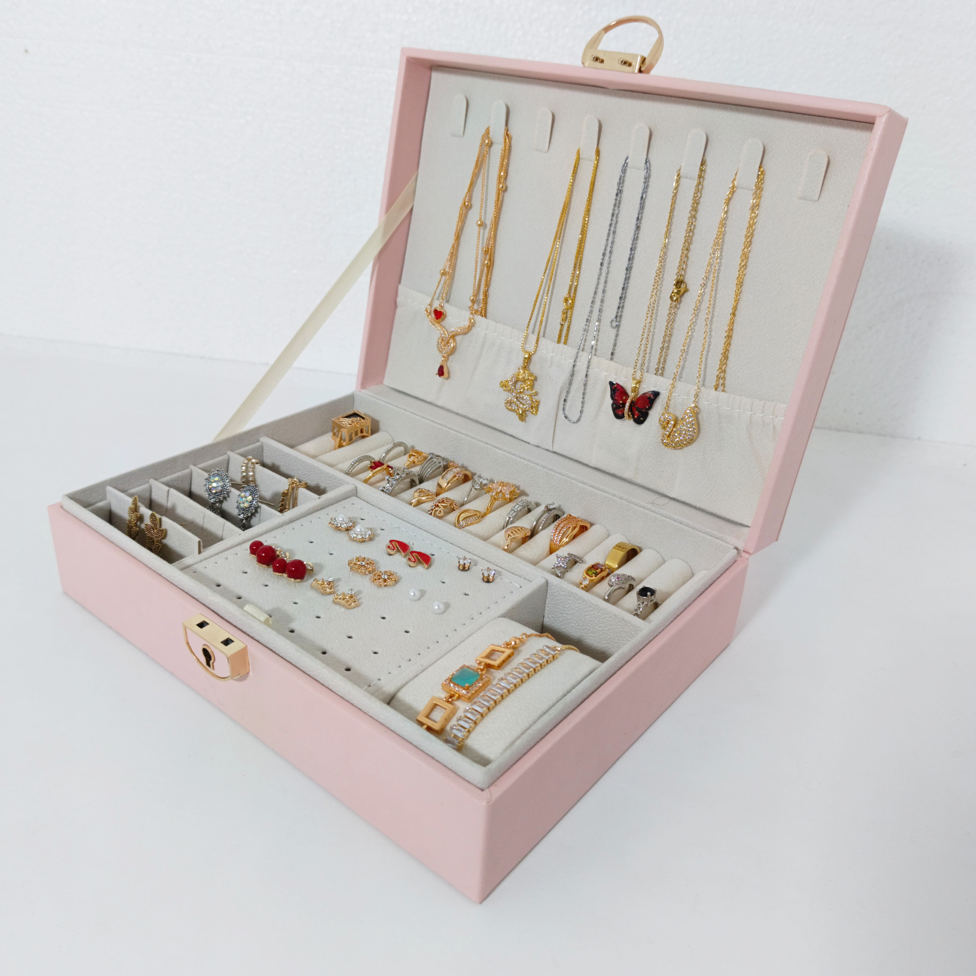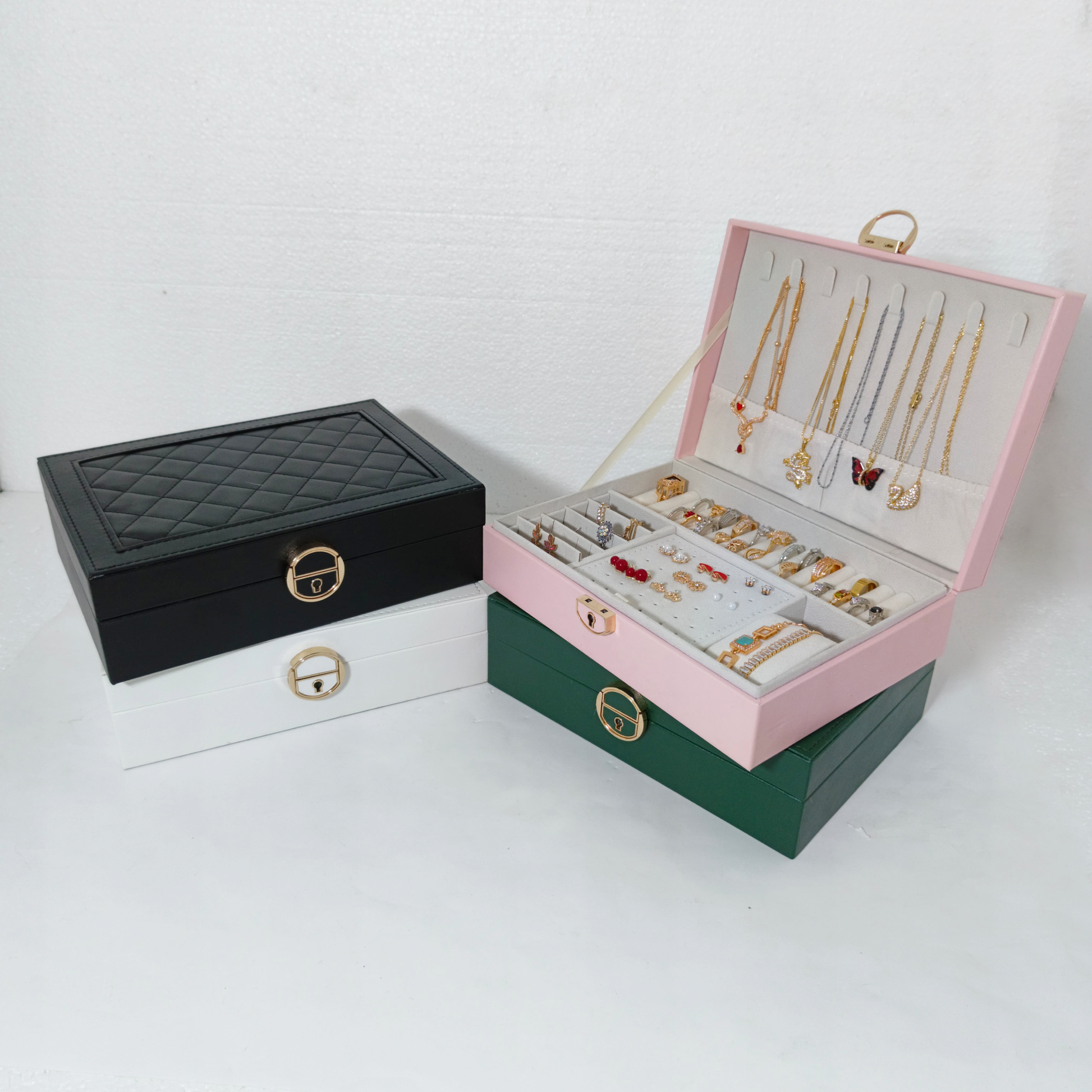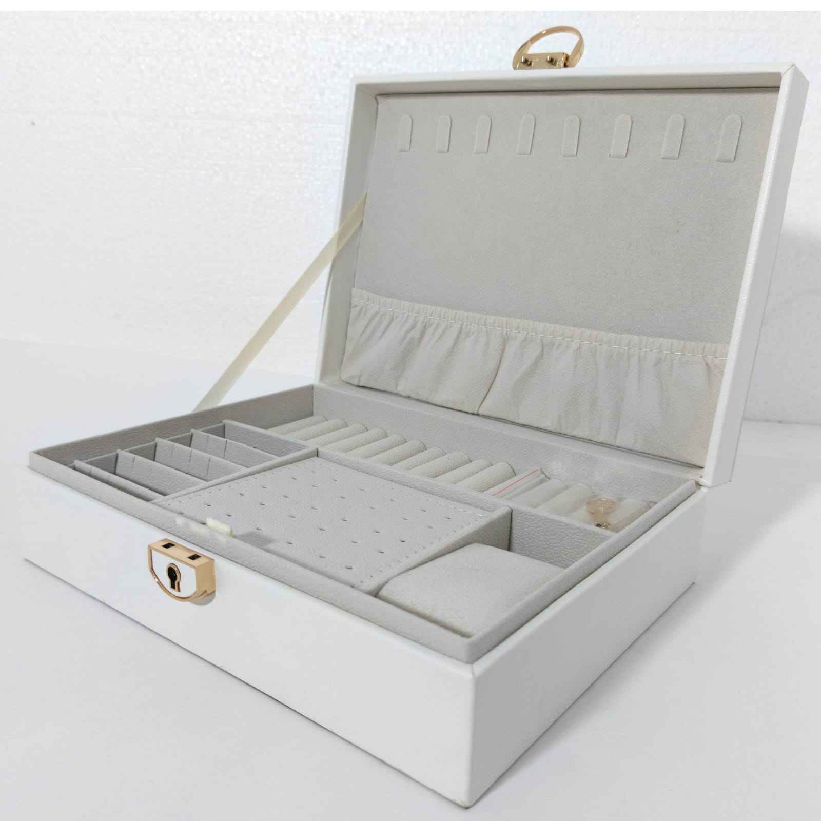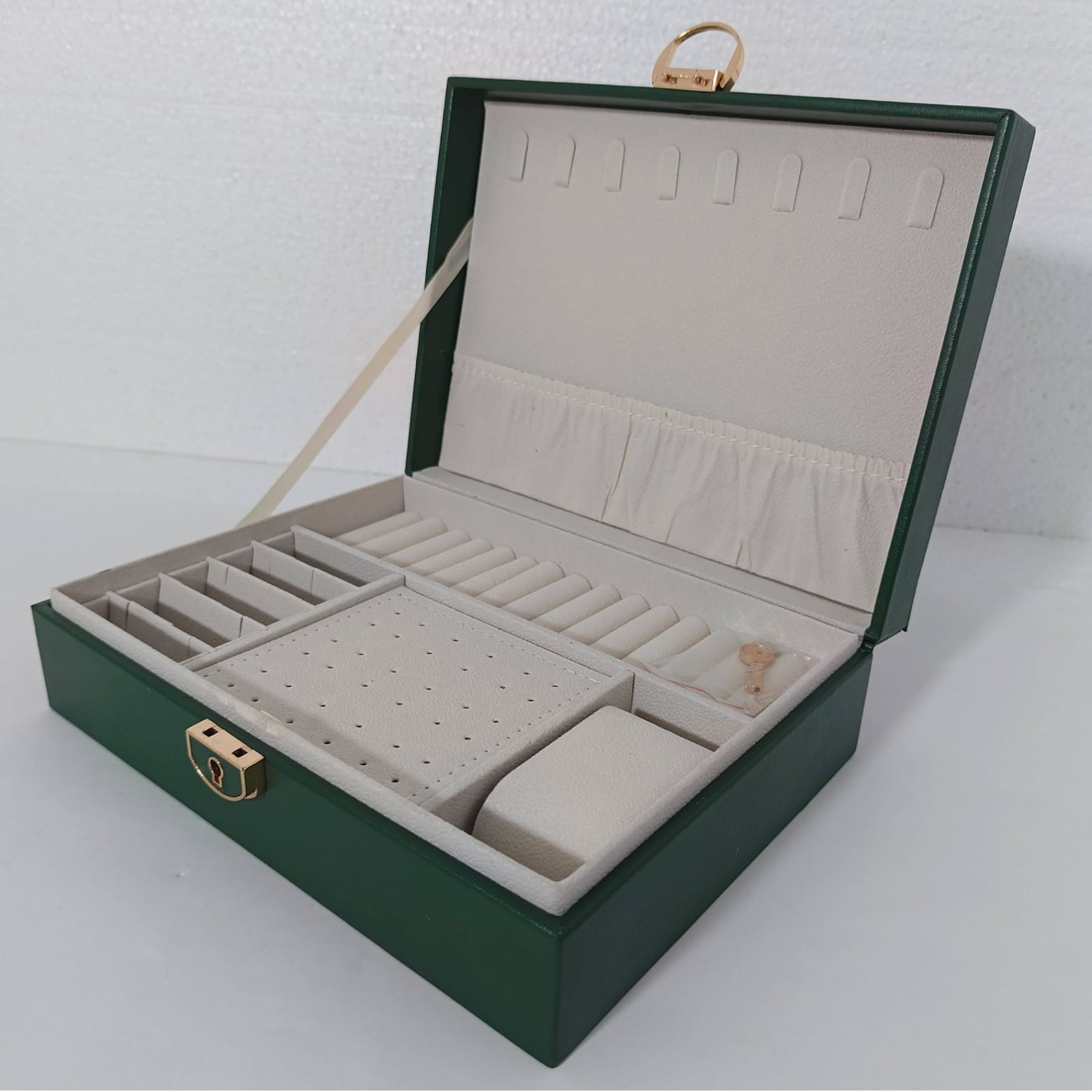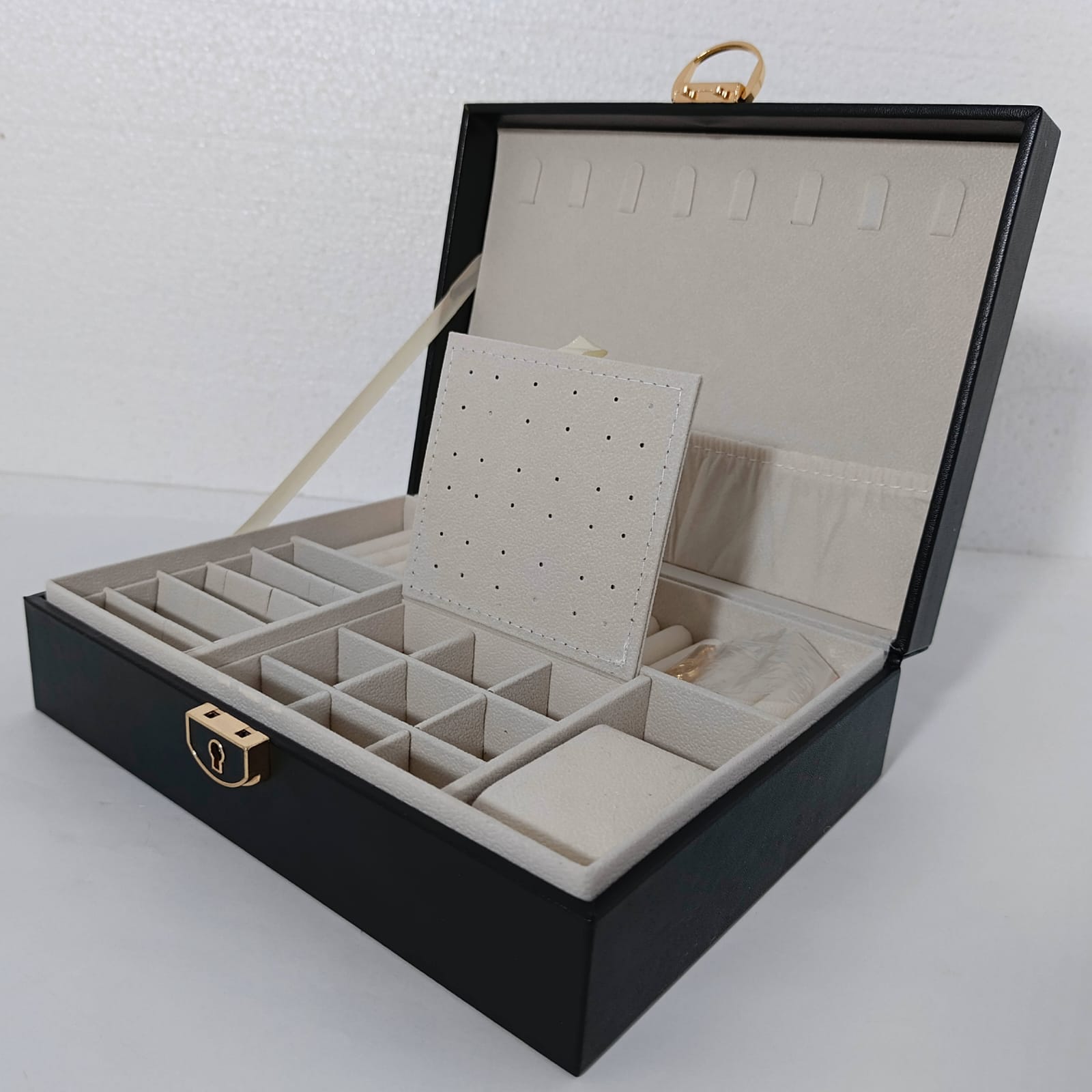 Introducing our Premium Large Jewelry Organizer made from high-quality faux leather for a sleek, elegant look. This spacious jewelry box features dedicated bracelet holder, earring holder, necklace holder, and ring holder, ensuring every piece of your collection stays organized and easy to access. With 9 small compartments, it offers plenty of space to store and organize your jewelry, from rings to necklaces, and keeps your pieces tangle-free and safe. The luxury jewelry organizer is durable, stylish, and the perfect solution for keeping your fine jewelry protected and neatly arranged. Ideal for both personal use and as a gift for jewelry lovers, this organizer blends functionality with a sophisticated design. Perfect for accessory storage, jewelry storage organizer, and faux leather jewelry box solutions.